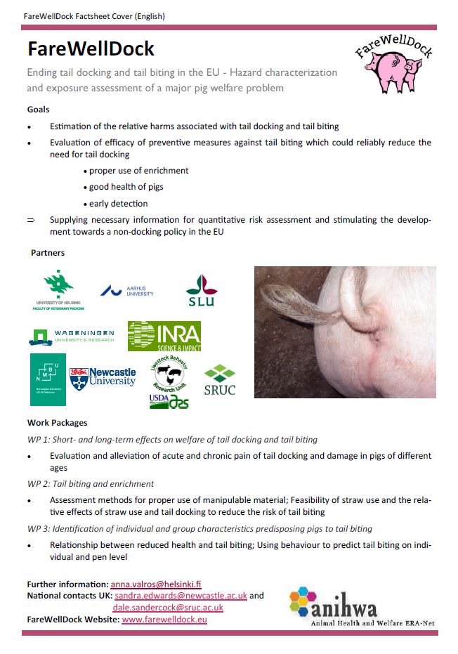 The FareWellDock factsheets are out. Below you find the cover factsheet as well as the factsheets on tail docking, enrichment, health and the prediction of tail biting. This post shows images of the English versions, and  links to the pdf version of the English factsheets, as well as all factsheets in Danish, Dutch, Finnish, French, Italian, Norwegian and Swedish. Separate pages are available directly showing the factsheets in the other languages (Danish, Dutch, Finnish, French, Italian, Norwegian and Swedish).