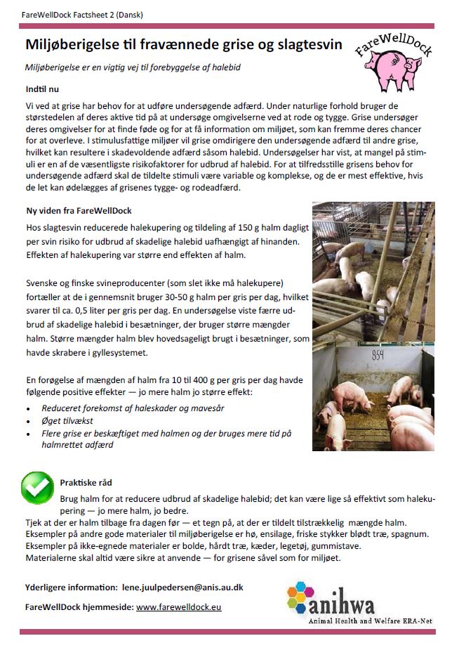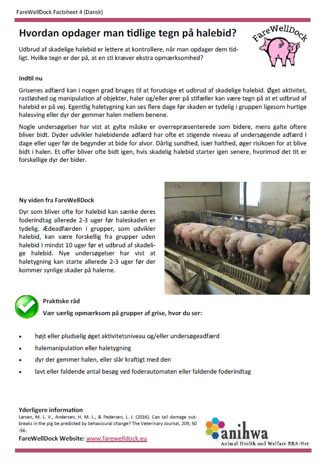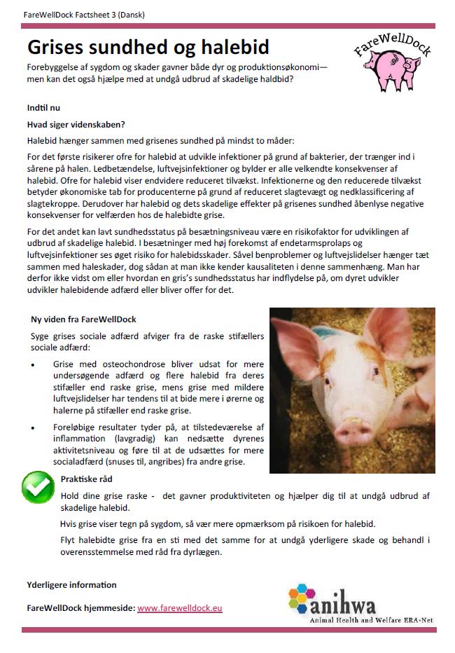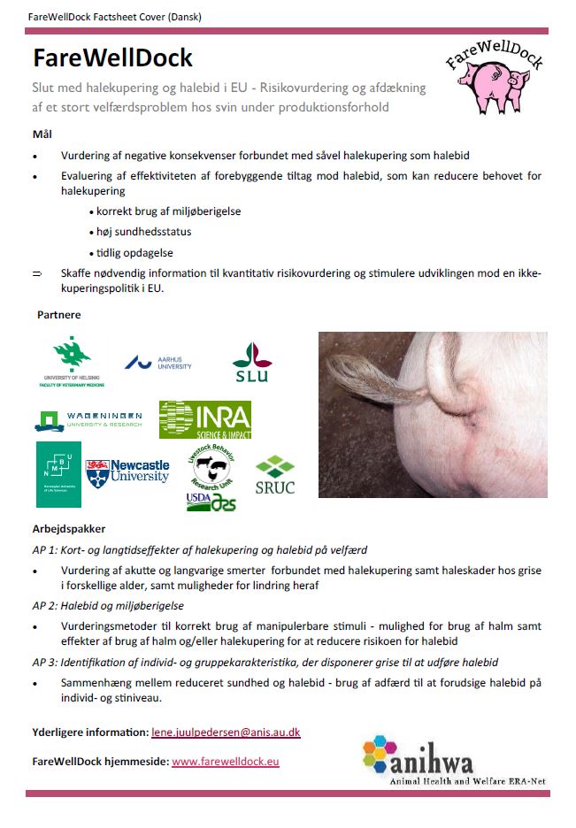 The FareWellDock factsheets are out. Below you find the cover factsheet as well as the factsheets on tail docking, enrichment, health and the prediction of tail biting. This post shows images of the Danish versions, and links to the pdf version of the Danish factsheets, as well as all factsheets in English, Dutch, Finnish, French, Italian, Norwegian and Swedish. Separate pages are available directly showing the factsheets in the other languages (English, Dutch, Finnish, French, Italian, Norwegian and Swedish).