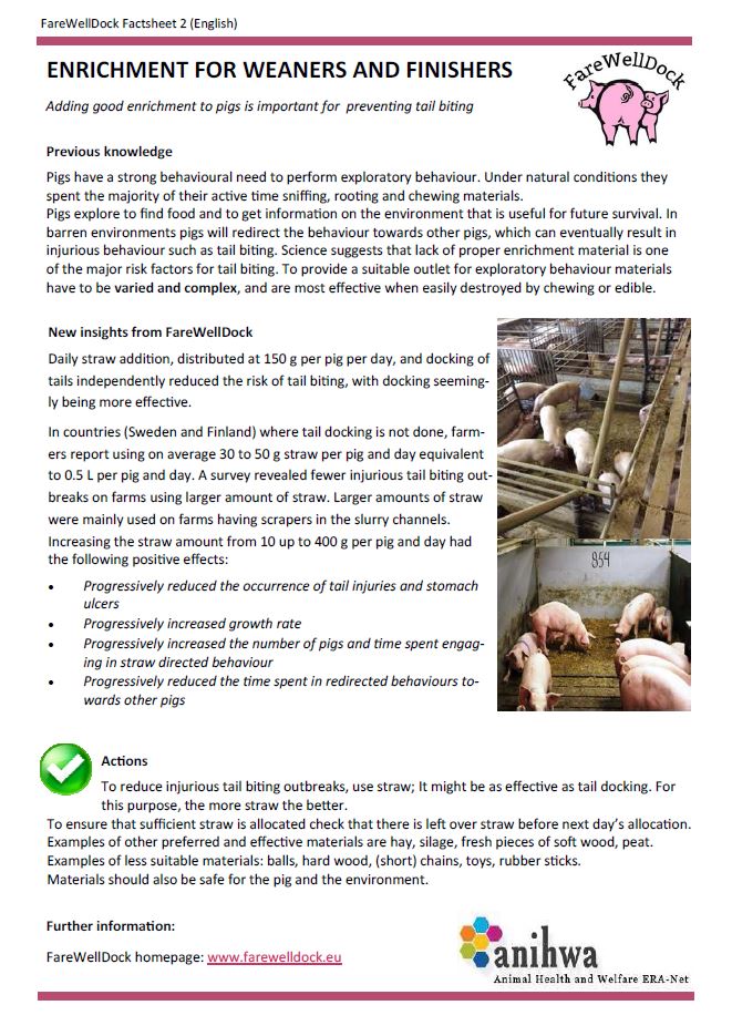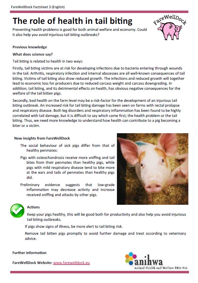 The FareWellDock factsheets are out. Below you find the cover factsheet as well as the factsheets on tail docking, enrichment, health and the prediction of tail biting. This post shows images of the English versions, and links to the pdf version of the English factsheets, as well as all factsheets in Danish, Dutch, Finnish, French, Italian, Norwegian and Swedish. Separate pages are available directly showing the factsheets in the other languages (Danish, Dutch, Finnish, French, Italian, Norwegian and Swedish).
