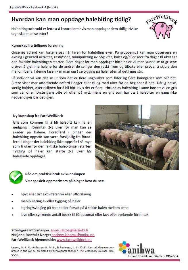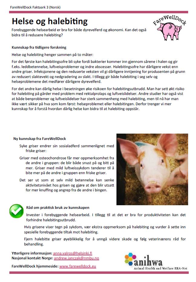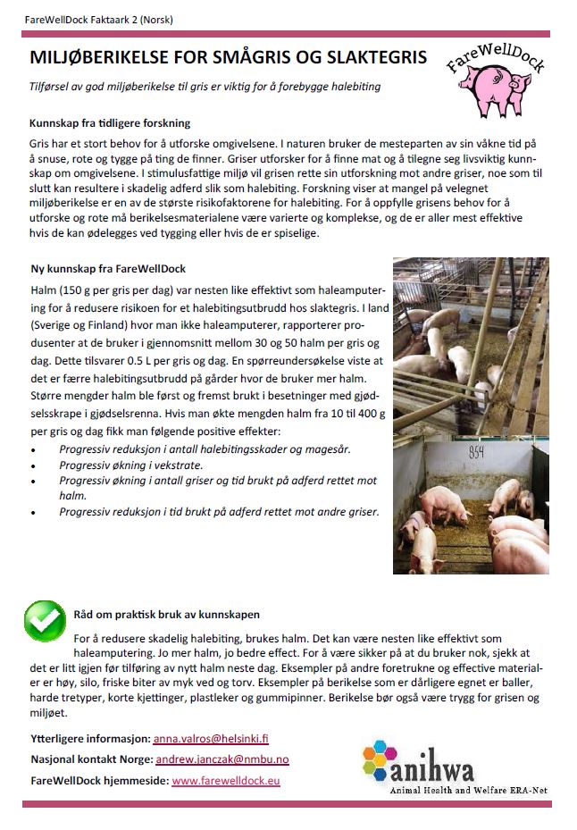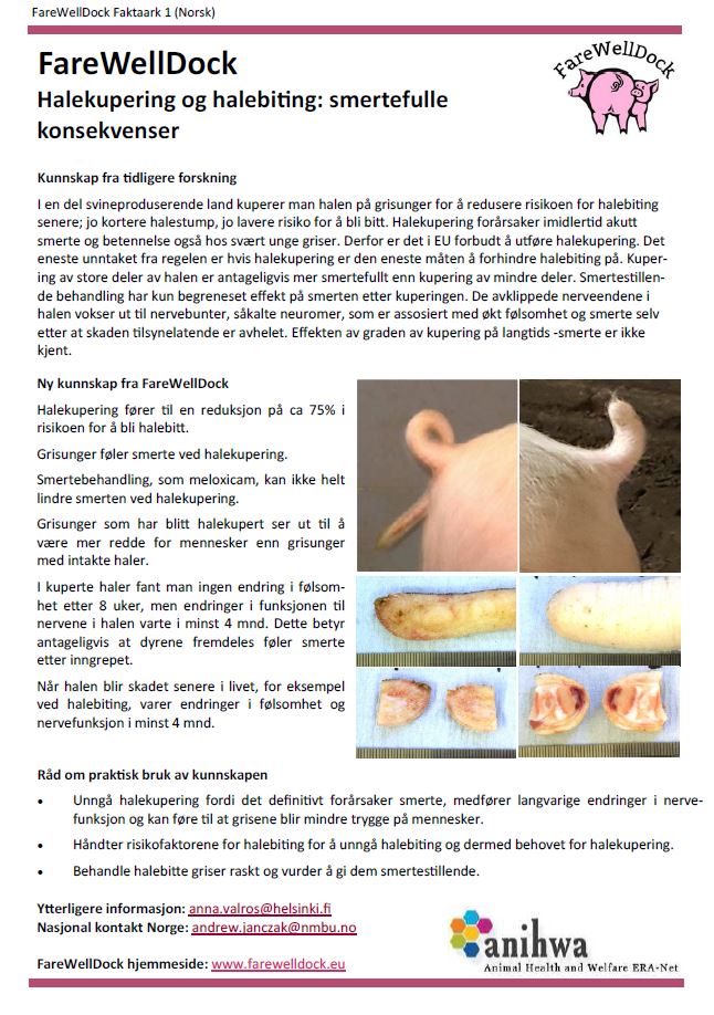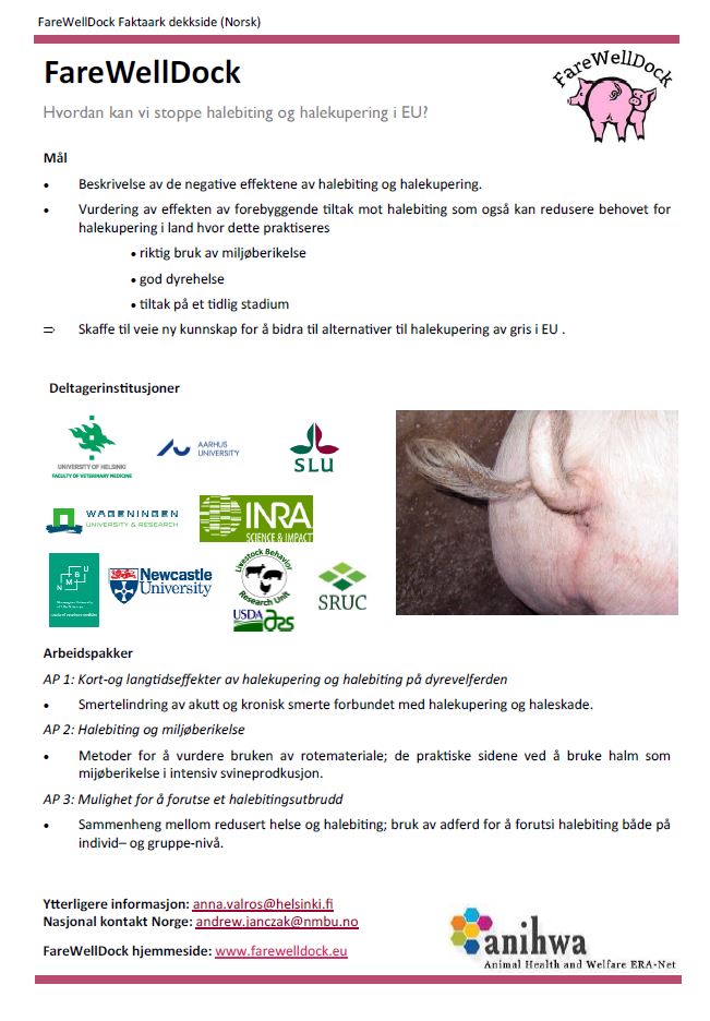 The FareWellDock factsheets are out. Below you find the cover factsheet as well as the factsheets on tail docking, enrichment, health and the prediction of tail biting. This post shows images of the Norwegian versions, and links to the pdf version of the Norwegian factsheets, as well as all factsheets in Danish, Dutch, Finnish, French, Italian, English and Swedish. Separate pages are available directly showing the factsheets in the other languages (Danish, Dutch, Finnish, French, Italian, English and Swedish).