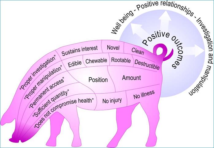 A screening method to assess the appropriateness of the level of enrichment on-farm was developed and includes scoring of the amount of unsoiled straw, the behaviour, and ear, tail and flank lesions of the pigs. AMI (animal-material interaction) sensors were used e.g. to show that pigs in biter pens were more interested in novel ropes than pigs in control pens, that environmental enrichment may reduce exploratory behaviour of point-source objects, and that sick pigs, experimentally infected with streptococcus spp, were less interested in chain manipulation. The sensors appear to be a promising tool to assess the use of manipulable material by pigs. In countries (SE and FI) where tail docking is not done, farmers report using on average of 30 to 50 g of straw/pig/ day, equivalent to about 0.5 L/pig/day. A survey in SE revealed fewer injurious tail biting outbreaks on farms using larger amounts of straw. Larger amounts of straw were mainly used on farms having scrapers in the slurry channels. A large experimental study showed that a moderate amount of straw (150 gr/pig/day) reduced injurious tail-biting outbreak in finisher pigs by more than 50%, while docking seemed to be more effective as it reduced tail biting by more than four-fold. The effect of both measures was additive, i.e. docking and straw reduced tail biting 9 fold. Further, it was shown that increasing the amount of straw from 10 to up to 400 gr/pig/day had multiple positive effects by progressively reducing the occurrence of tail injuries and stomach ulcers, increasing growth rate, increasing straw-directed behaviour, and reducing redirected behaviours towards other pigs.