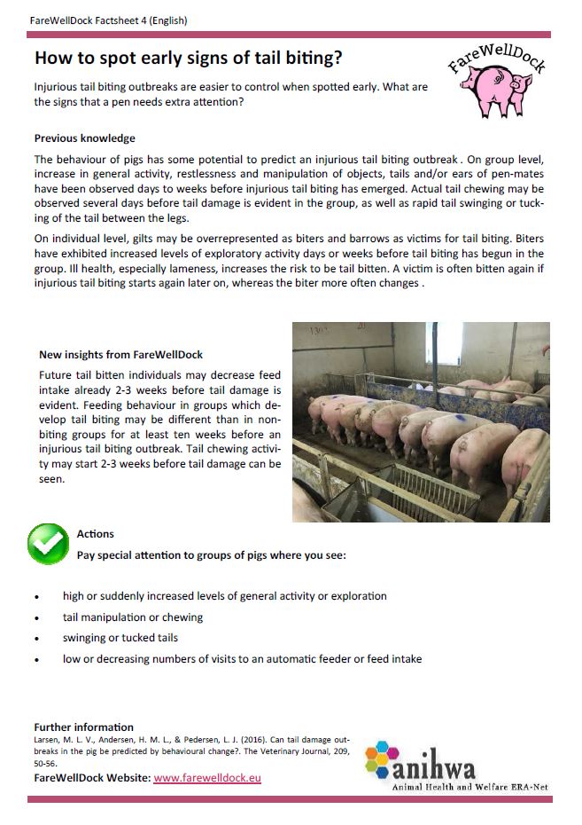 The FareWellDock factsheets are out. Below you find the cover factsheet as well as the factsheets on tail docking, enrichment, health and the prediction of tail biting. This post shows images of the English versions, and links to the pdf version of the English factsheets, as well as all factsheets in Danish, Dutch, Finnish, French, Italian, Norwegian and Swedish. Separate pages are available directly showing the factsheets in the other languages (Danish, Dutch, Finnish, French, Italian, Norwegian and Swedish).